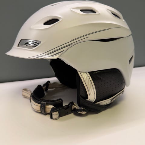 Smith skihjelm i størrelse M, 55–59 cm. Hjelmen er hvit og har flere ventilasjonsåpninger for lufting. Innvendig er det polstret fôr og netting for komfort. Justerbar hakestropp for tilpasning. Egnet til alpint og annen vintersport der det er behov for hodebeskyttelse.