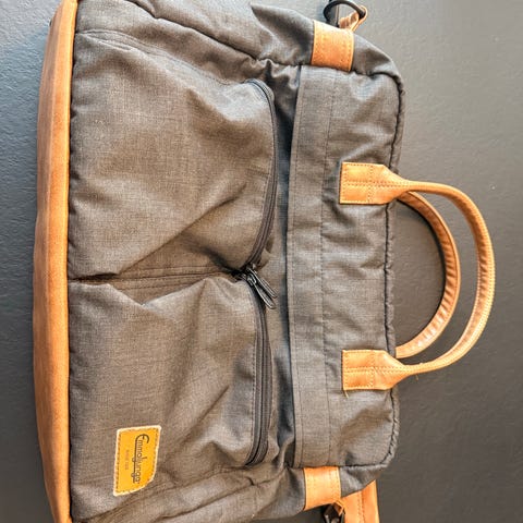 Emmaljunga stelleveske i grønn farge, laget av stoff med skinndetaljer. Vesken har to håndtak og en justerbar skulderrem. Den har flere lommer, inkludert to frontlommer med glidelås, et romslig hovedrom med glidelås og et eget rom til stellematte.