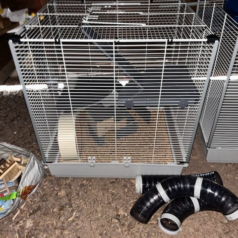 Smådyrbur i plast egnet for små gnagere som hamster eller lignende. Buret har blå bunn og gjennomsiktig overdel med metallgitter på toppen for lufting og tilgang. Inne i buret følger det med løpehjul, vannflaske og matskål i plast. På utsiden er det montert en gjennomsiktig plasttunnel som dyret kan bruke til aktivitet. Flere runde åpninger i sidene gir mulighet for å koble til ekstra tunneler eller tilbehør. Buret er lett å rengjøre ved å ta av overdelen fra bunnen.