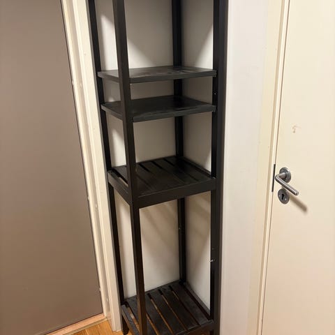 IKEA HEMNES hylle i hvitmalt tre. Smal, høy hylle med flere faste hyller, både tette og spaltehyller. Egnet til oppbevaring på bad, soverom eller andre rom der det er behov for en plassbesparende hylleløsning. Klassisk, enkel utforming som passer inn i mange typer interiør. Noen bruksmerker, se bilde av de tydeligste.