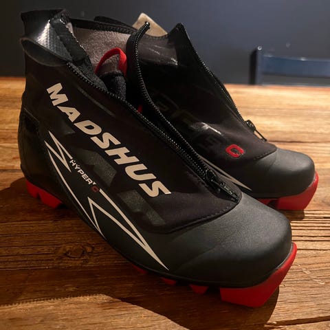 Madshus CT 100 JR langrennsstøvler i størrelse 31. Modellen er en juniorsko for klassisk langrenn. Skoene har snøring med glidelåslukking over vristen for å beskytte mot snø og fukt. Overdelen er i syntetisk materiale med forsterket tåparti. Sålen er beregnet for bruk med klassiske langrennsbindinger (NNN-system). Farge hovedsakelig svart med grå og røde detaljer.