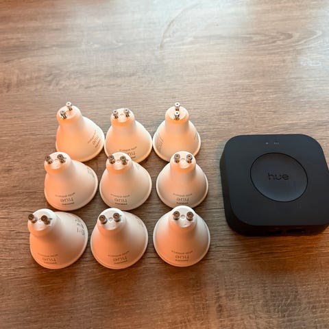 Selger totalt 11 Philips Hue WCA 6.5W GU10 White & Color grunnet overgang til annen lyspære-sokkel. Disse har aldri vært i bruk.