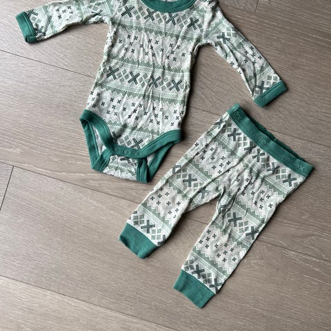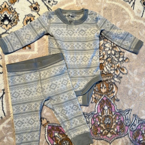 Reflex ullsett bestående av body (str 62) og bukse (str 68). Setter er i 100% ull med hvitt og blått mønster. Setter har fått et par flekker (ikke veldig fremtredende), men er ellers i god stand. Flekkene er på høyre skulder og venstre ben. Se bilder.