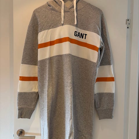 Kjolen er blå og laget i bomull med noe elastan for stretch. Modellen har hette med snøring, lange ermer og ribbekanter. Lengden går omtrent til kneet eller litt under, avhengig av høyde. Fronten har ton-i-ton Gant-logo og skjoldmotiv. Passer som hverdagskjole eller avslappet hettekjole i fritiden.