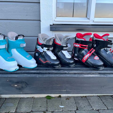 Pakke med flere par alpinski, langrennski og ett snowboard med bindinger til barn. Skiene har ulike lengder og farger, med integrerte alpinstøvle-bindinger tilpasset barn. Snowboardet har grafisk motiv og monterte snowboardbindinger. Utstyr egnet for alpint og snowboardkjøring for barn, for bruk i skibakke og på preparerte løyper. Det følger også med noen par skistaver i ulike lengder, tilpasset barn og unge.