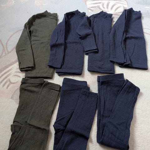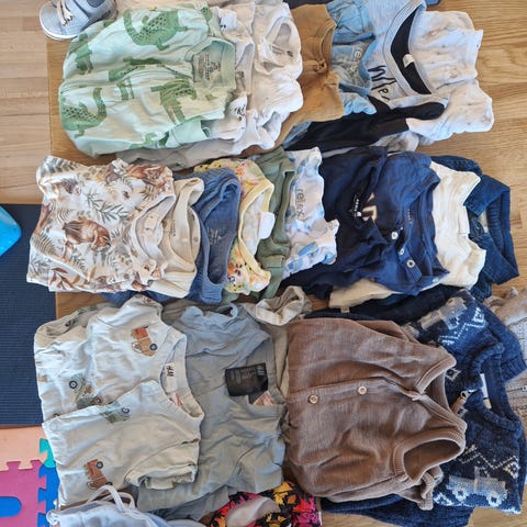 Pysjer, collegesett, masse sokker og ett par tøfler, jeans, skjorte, ullsett (fra joha og reflex, disse er i str 98/104).