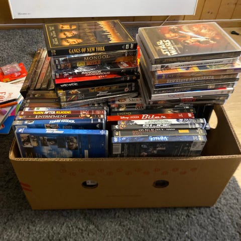 Samling med diverse DVD filmer og TV-serier i pappesker. Inneholder ulike sjangre som komedie, drama, action og romantikk, samt enkelte TV-serier. Platene leveres i original DVD-cover der dette vises på bildene. Egner seg for den som ønsker en variert samling DVD-titler til hjemmekino eller samling. Antall titler og konkrete filmtitler fremgår delvis av bildene.