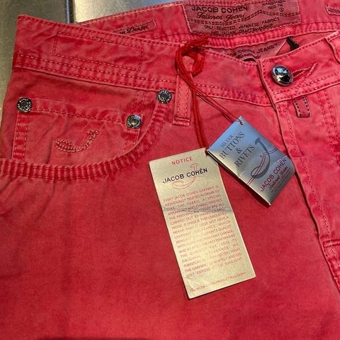 Jacob Cohën str 31 – eksklusive jeans med rå røde detaljer