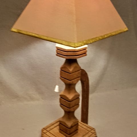 Gammel bordlampe i heltre. Utskåret og malt blomstermønster. Diameter ca 15 cm. Høyde ca 30 cm uten skjerm. Ca 35 cm med skjerm. Av/på bryter på ledningen. Tils kr 300 eller bud