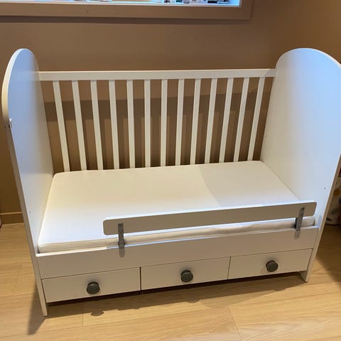 Selges med madrass brukt til 2 barn, alltid med tisselaken på. Sengen har noen bruksmerker, men er i god stand og kan brukes i mange år til da det er en solid seng.