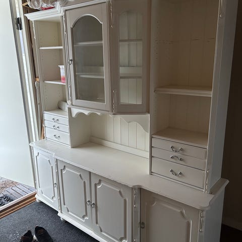 To deler satt sammen til dette vitrineskap m belysning. Gir god plass til glass og porselen og/eller annet.