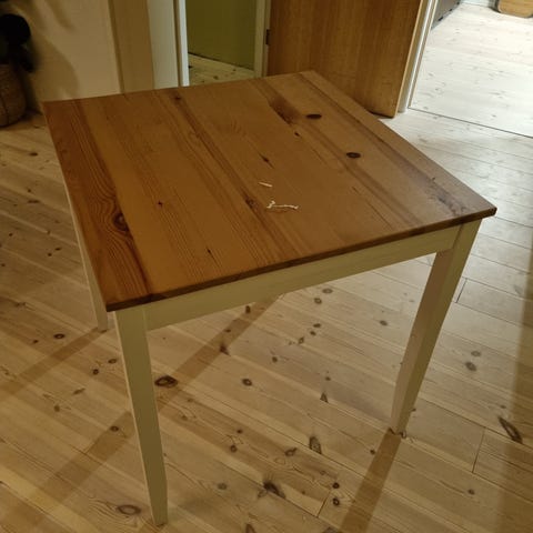 Bord: Bordet er funksjonelt og stabilt, men har noen synlige sprekker i overflaten på bordplaten (se bilder). Dette påvirker ikke bruken, men bordet selges derfor veldig billig.
