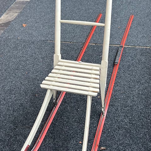 sparkstøtting i kombinasjon av tre og metall. Rammen er lakkert i rødt metall, mens sete og håndtak består av trelameller. Modellen har to lange meier i metall som gir stabilitet på snø og is. Egner seg til bruk på vinterføre for transport eller turkjøring for både barn og voksne, avhengig av høyde og vektbegrensning fra produsent. Klassisk utforming med ståplass bak sete og tverrstang til å holde i under bruk.
