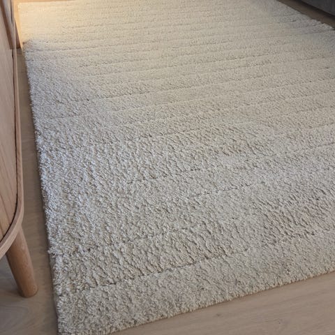 Teppet er kjøpt på Rusta for noen år tilbake. Si i fra om du trenger mål :) Har vært i et hjem med katt.