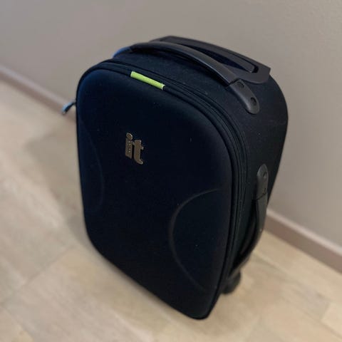 Kofferten har uttrekkbart teleskophåndtak og to hjul for enkel transport.
