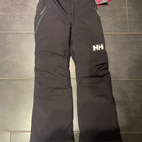 Helly Hansen ski/vinter bukse i størrelse 164 for unisex. Buksen er mørk blå og har glidelåslommer foran med kontrastfarge og HH-logo på det ene benet. Buksen passer bra til vinterstøvler da den har strikk inne i benet til å ta rundt. Det er en liten rift på stoffet foran, som vist på bildet, ellers er den veldig pent brukt.