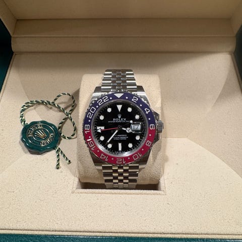 Rolex GMT‑Master II ref. 116710LN med keramisk svart bezel (utgått modell). Kjøpt i Kina i 2018 uten MVA. Jeg er eneste eier, klokken er forsiktig brukt.