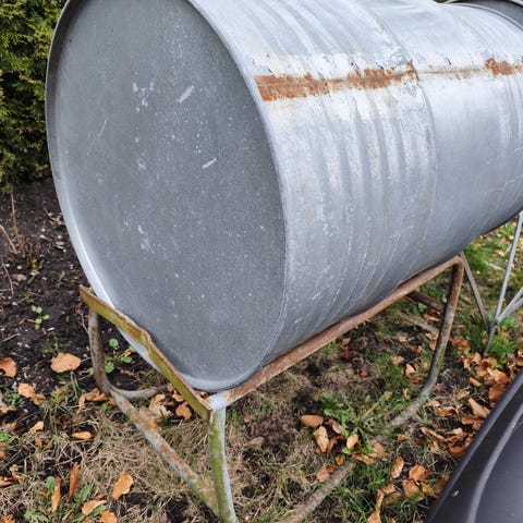 Metalltønne med lokk. Tønnen er laget av metall og har synlig overflaterust. Lokket ligger løst oppå åpningen. Egner seg for bruk der det er behov for en enkel beholder, for eksempel til oppbevaring utendørs eller som brennetønne, avhengig av behov og lokale regler.
