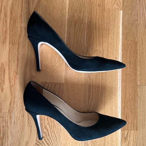 Sorte hæler i str 37 med sølvdetalj fra Roberto Botella. Noen bruksmerker (rynker i stoffet, se bilde nr 4), men ellers i fin stand