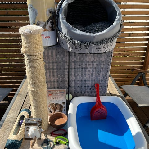 Kattetoalett, smussmatte, kattebæsjposer, spader og kattehus. Selges som en startpakke kr 300,-
