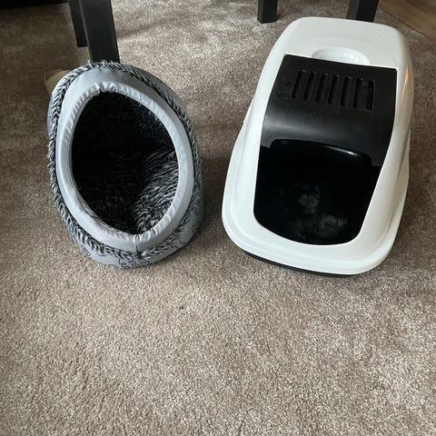 Kattesett med flere produkter til katt. Inneholder et lukket kattedo med luke i plast, flere kattespader og en matte til å ha foran doen. I tillegg følger det med et grått kattehus i filtstoff med pute inni, samt et utvalg katteleker og annet kattetilbehør som halsbånd, børste og aktivitetsleker. Egnet som ekstrasett eller som grunnutstyr til katt med både toaløsning, liggeplass og leker i én pakke. Samlet pris kr 300,-. Pris for selvplukk aktivitetsleker avtales ved oppmøte.
