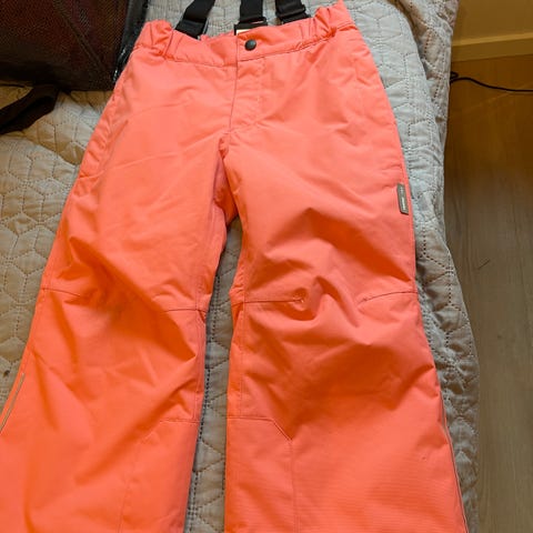 Vinterbukse til barn i størrelse 128, med strikk inne i beina til å feste over alpint sko eller vinter boots. Pent brukt, ingen huller.