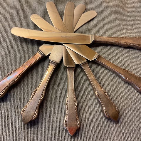 Forskjærskniv fra Brødrene Lohne i serien "Laila". Brødrene Lohne hadde edelmetallverksted i Kaigaten i Bergen og var i drift fra 1921. Mønsteret "Laila" ble designet av for Brødrene Lohne av Torvald Olsen i 1935.