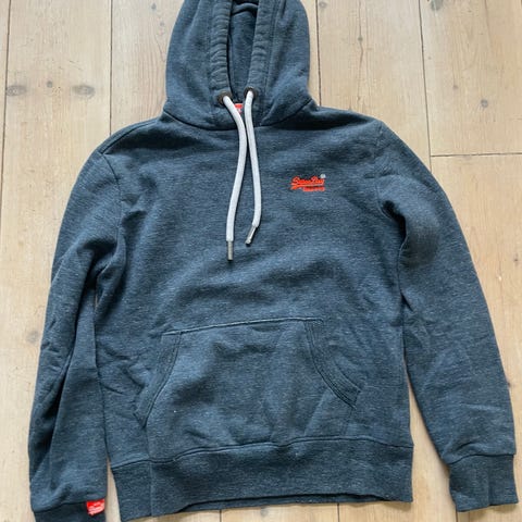 Superdry hettegenser for herre i størrelse M. Genseren er grå og laget i bomull. Den har hette med snøring, kengurulomme foran og ton-i-ton Superdry-logo på brystet. Passer til hverdagsbruk og fritidsaktiviteter.