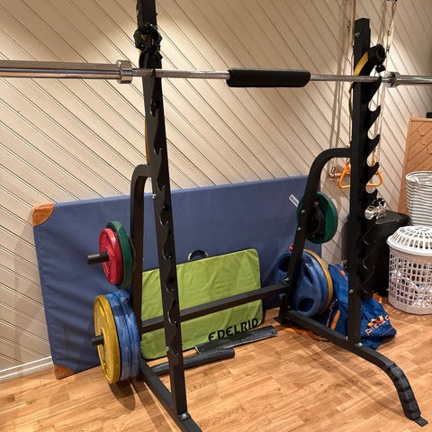 Styrkepakke/ komplett gym med treningsutstyr for hjemmegym. Pakken inkluderer et frittstående stativ/ half rack, og justerbar benk, vektstang med tilhørende vektskiver i ulike vekter, samt oppbevaringsstativ for skiver.