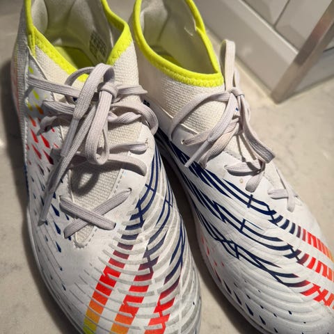 Puma innendørs fotballsko futsalsko str 38,5 i oransje og svart. Skoene har snøring foran og mønstret overdel som gir godt grep på ballen. Yttersålen er flat og laget for innendørs baner, med mønster som gir friksjon mot underlaget. Passer til futsal eller annen innendørs fotballaktivitet.
