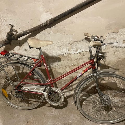 One Twelve barnesykkel med 24" hjul i rød farge. Sykkelen har klassisk ramme med lavt innsteg, bagasjebrett bak og skjermer foran og bak. Utstyrt med kjedekasse, ringeklokke og reflektorer på hjul og pedaler. Passer til barn som trenger en sykkel med 24-tommers hjul til hverdagsbruk og sykling på vei og gangsti.