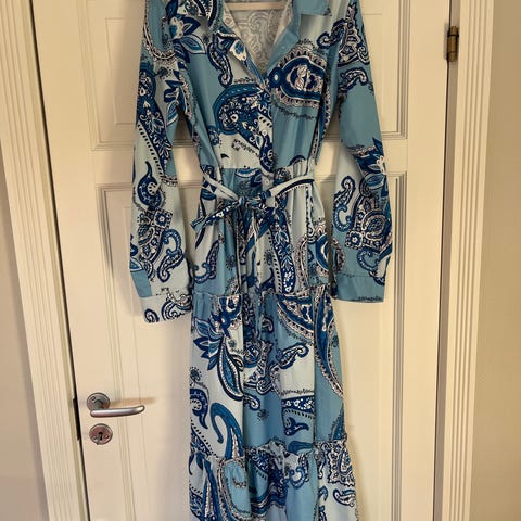 Lang, lett sommerkjole med hvitt/blått mønster.