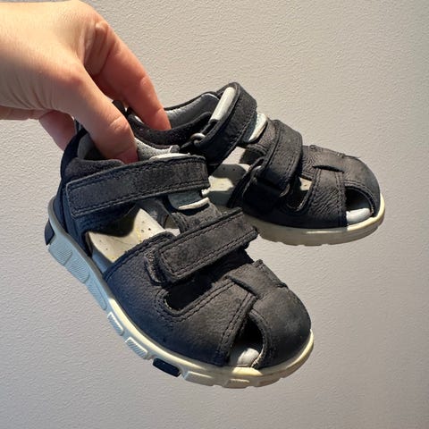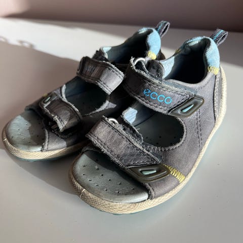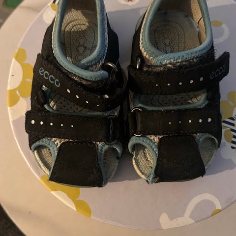 Ecco barnesandaler i størrelse 22 for unisex. Åpne sandaler med justerbare borrelåsstropper over fot og rundt ankel. Overdel i blått materiale med polstret innside for komfort. Lys, fleksibel yttersåle med godt mønster for grep. Egnet som sommersko eller innesko for barn i aktuell størrelse. Brukt av et barn en sommer