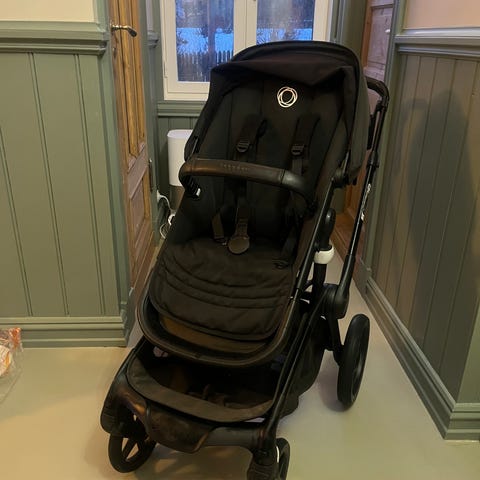 Bugaboo barnevogn i svart farge. Vognen har justerbar sittedel med fempunktssele og polstret sete. Den har kalesje som kan trekkes godt frem, med ventilasjonsfelt. Under vognen er det en oppbevaringskurv. Små, dreibare hjul gjør vognen egnet til bruk i bymiljø og på jevnt underlag. Passer til ett barn.