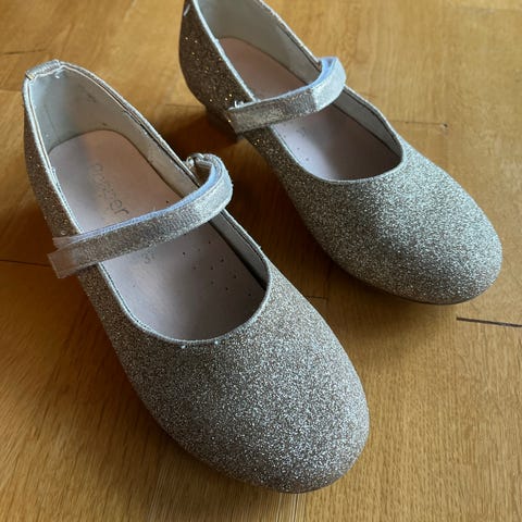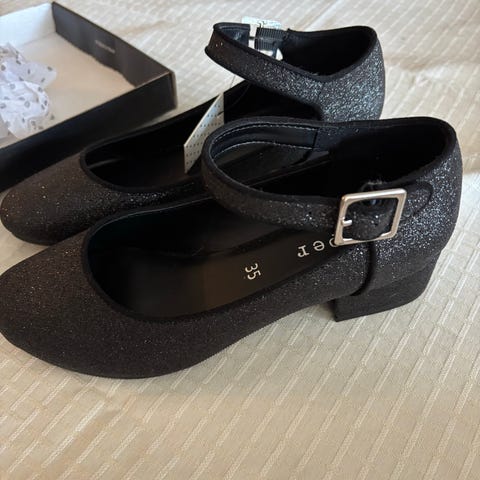 Nye, ubrukte pensko i gull str 35. Svarte pensko i str 35, pent brukt, følger også med.. kr 200