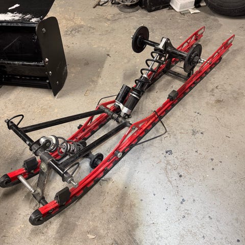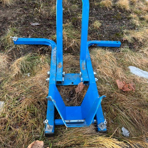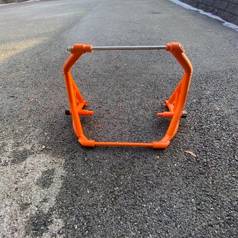Justerbar motorsykkelstøtte i metall, i fargene rød og svart. Støtten har flere hull for justering og tilpasning til ulike hjulbredder og -størrelser. Egnet for å holde motorsykkelen stabil ved parkering, vedlikehold eller lagring. Konstruktionen består av en ramme med festeplater og vinkeljern som gir støtte til hjul og gaffel/svingarm. Kan brukes i garasje, verksted eller ved transport der det er behov for å sikre motorsykkelen bedre.