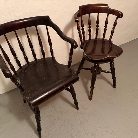 Gamle og muligens antikke «kongestoler» i eik med flotte utskjæringer og mønstret brodert trekk i blå og grønne toner. Stolene har utskårne detaljer på armlener og ben, samt dekorative nagler langs stoffkanten. Stolene har høy rygg og fast sete. Baksiden er trukket med grønt velurstoff.