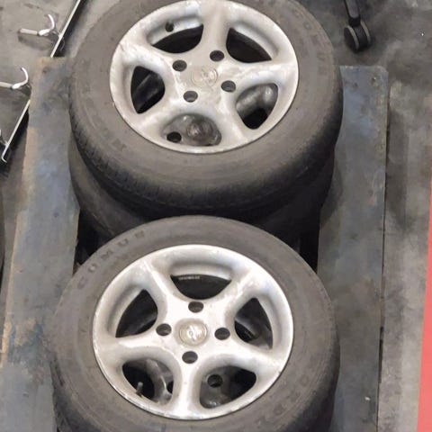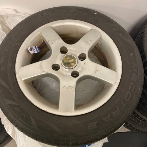 4 lettmetall felger med slitne sommerdekk selges samlet kr 800. Kan leveres i Østfold eller hentes på Galtø i Sverige - mellom Strømstad og Grebbestad