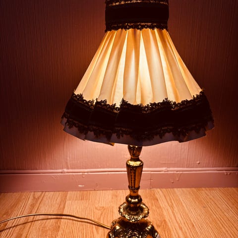 vintage lampeskjerm, Art Deco skjerm, retro lampeskjerm, liten lampeskjerm, messing skjerm, silkeskjerm, dekorativ lampeskjerm, frynser, krystall detalj, gul lampeskjerm, kremhvit lampeskjerm, antikk stil, bordlampe skjerm, nostalgisk skjerm, elegant lampeskjerm, 1920-talls stil, vintage interiør, retro belysning, klassisk lampeskjerm, dekor skjerm.