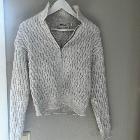 Strikket cardigan for dame i størrelse S. Strikket i grå ull/angora blanding med rund hals og perleknapper foran. Modellen har strukturstrikk, vide ribbestrikkede ermer med utsvingt mansjett og rett passform i livet. Cardiganen passer til hverdagsbruk og kan brukes lag-på-lag over topper, skjorter eller kjoler.