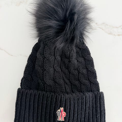 Moncler lue i ribbestrikket ull i størrelse S for dame. Lua er hvit og har oppbrettkant og dusk på toppen. Klassisk Moncler-logo foran. Materiale ifølge merkelapp er ull. Passer til hverdagsbruk i kaldere vær.