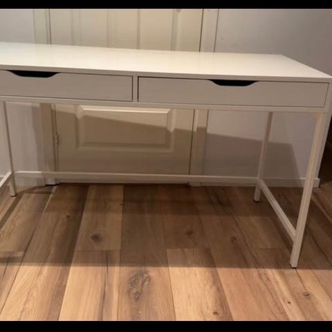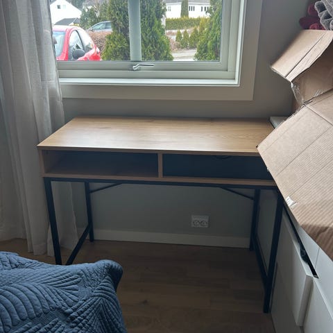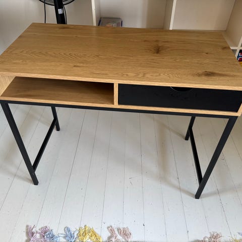 Nesten helt ubrukt skrivebord i svart med to uttrekkbare skuffer i front. Bordet har rektangulær bordplate og et åpent understell med tverrstag for ekstra stabilitet. Overflaten er glatt og enkel å tørke av. Egnet som arbeidsbord eller hjemmekontorpult, med god plass til PC, skjerm og annet kontorutstyr. Bordet har også en åpning i bordplaten som kan brukes til kabelgjennomføring eller oppbevaring under lokk.