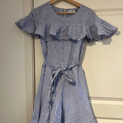 Zara sommerkjole for dame i størrelse M. Kjolen er blå med smale hvite striper og er laget i bomull. Den har korte ermer, elastisk utringning og knytebelte i livet. Lengden går omtrent til under kneet, avhengig av høyde. Passer til hverdagsbruk og lette sommeranledninger.