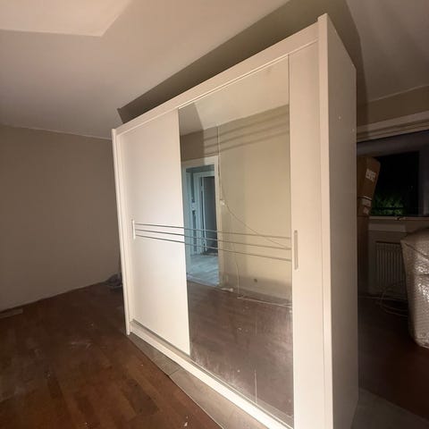 Hvitmalt furskap med speil . Delvis hyller delvis på venstre og høyre side oppheng