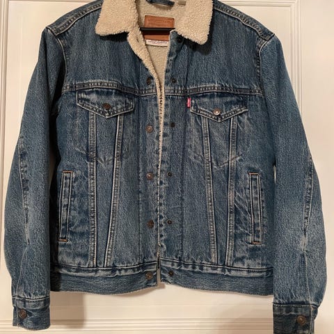 Levi's denimjakke størrelse M. Jakken er blå og laget i denim. Den har krage og fôr i teddy/fleece, knappelukking foran, brystlommer med klaff og sidelommer. Passer som ytterjakke i kjøligere vær.