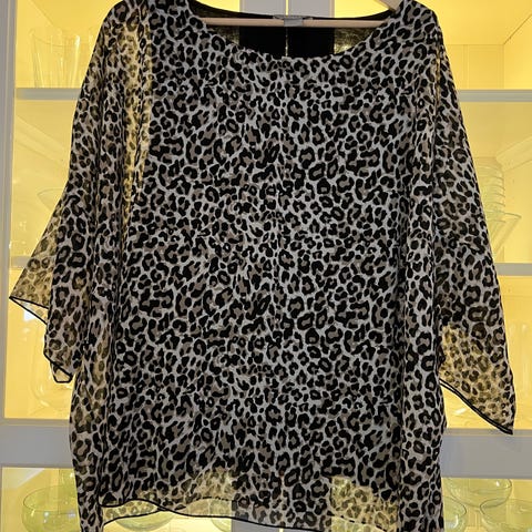 Gina Tricot body topp for dame i størrelse XL. Toppen er laget i polyester og har brun leopardmønster. Modellen har dyp V-utringning, lange ermer i lett, gjennomsiktig stoff og ensfarget sort parti nederst med body-fasong. Passer til bruk sammen med bukser eller skjørt til hverdags eller mer pyntede anledninger.
