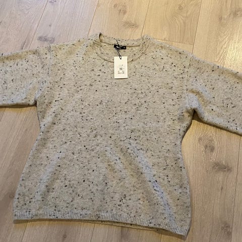Bik Bok genser for dame i størrelse XS. Genseren er beige melert med små mørke prikker og har rund hals og lange ermer. Materiale ifølge lappen: 64 % polyester, 13 % resirkulert polyester, 20 % ull og 3 % elastan. Lett innsving i midjen.