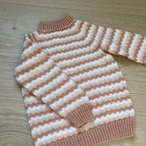 Hjemmestrikket islender til barn, bunnfarge er hvit med gammelrosa «luser»
