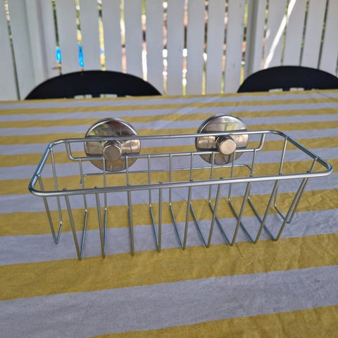 Dusjkurv i metall med to sugekopper for montering på glatt overflate som fliser eller glass. Egnet til oppbevaring av såpe, sjampo, balsam eller andre baderomsartikler i dusj eller på bad. Perfekt dersom man ikke ønsker å bore i fliser.