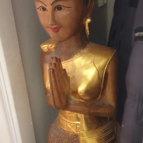 Flott og dekorativ figur i orientalsk stil selges. Figuren forestiller en kvinne i tradisjonell drakt med hendene samlet i en vennlig og velkomstende gest. Den er rikt dekorert med flotte detaljer i gull, grønt og rødt, og passer perfekt som blikkfang i entré, stue eller på et kontor.